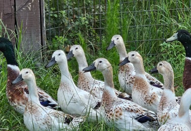 Our Welsh Harlequin ducks are all grown up and have started laying! And they're just gorgeous. We selected this breed for the decent egg laying and calm, friendly personalities. They're too heavy to fly well, so generally don't fly. They're very pretty with the males having iridescent green heads and females being a white or cream color as adults. They're also supposed to be good eating and get to a decent size.