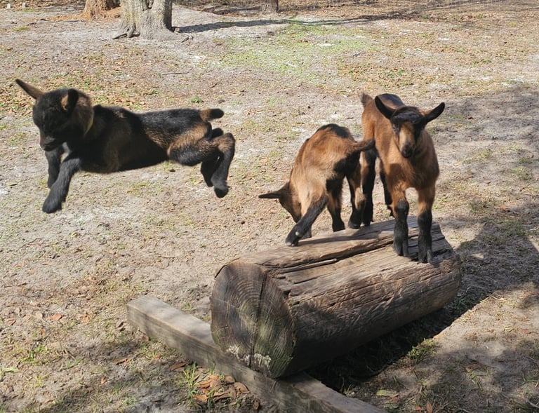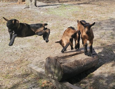 Goats also bring humor and joy in a way few other animals can. They’re playful, clever, and full of personality. The kids run, climb, and balance on anything they can find. Logs, stumps, feeders, while the adults play lazy headbutt games on cool afternoons. They’re interactive animals; they make eye contact, respond to your voice, and often come looking for scratches or a tug on your shirt sleeve just to say hello.