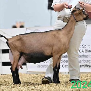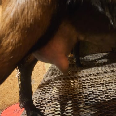 His dam (Ruby) has a decent little tidy udder, shown here. This is 2 days into her first freshening. His sire (Wild Hoof Acres Trailing Looks), pictured in the last picture, is from generations of winning show and strong milk genetics. He is our junior herdsire, and we're hoping to improve our herd here with him.