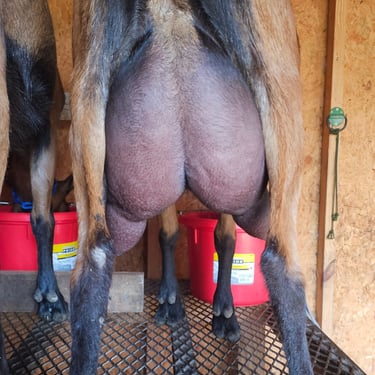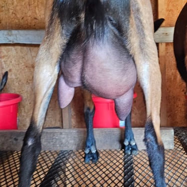 His dam (Ruby) has a decent little udder, shown here. This is 7 weeks into her first freshening. His sire (Wild Hoof Acres Trailing Looks), pictured in the last picture, is from generations of winning show and strong milk genetics. He is our junior herdsire, and we're working to improve our herd here with him.